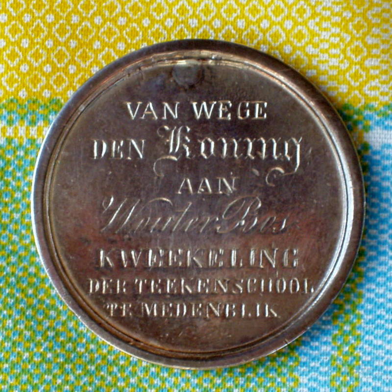Toen Wouter 15 jaar oud was werd hem deze zilveren penning in 1857 uitgereikt. Hij was er zo trots op dat hij er een gat in boorde om hem aan een spijker op te kunnen hangen. Later is dit gat weer dichtgemaakt. Op de voorkant van deze penning staat Minerva, de godin van de wijsheid. Zij heeft in haar linkerhand de hoorn des overvloeds en in haar uitgestrekte rechterhand een lauwerkrans. Zij zit voor een altaar en aan haar voeten liggen ondermeer een passer, winkelhaak, schilderspallet met penselen, een rol papier en een hamer. De penning is aan de voorkant voorzien van de letters VDK (Van Der Kellen). Johan Philip van der Kellen was de vormgever van de penning. Op de achterkant is gegraveerd: Vanwege de Koning aan Wouter Bos, Kweekeling van de Teekenschool in Medemblik.