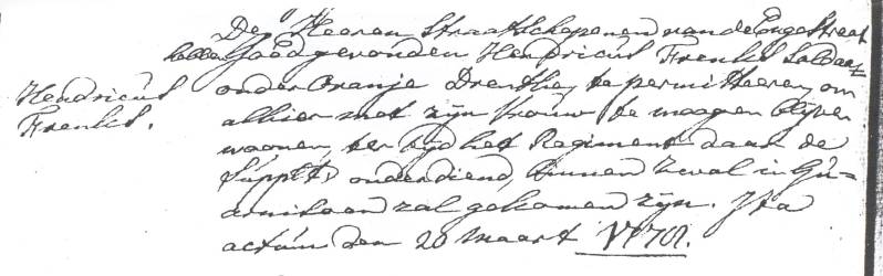 Op de rangeerlijst van 27 maart 1781 van het "2e bateljon regiment infanterie Oranje Stad en Lande en Orange Drenthe" staat Hendrik Frenks in Vlissingen vermeld als ziek. Waarschijnlijk heeft hij toen het leger verlaten. Een jaar later komt zijn vrouw Anna Margaretha Kiesel in Vlissingen te overlijden.
